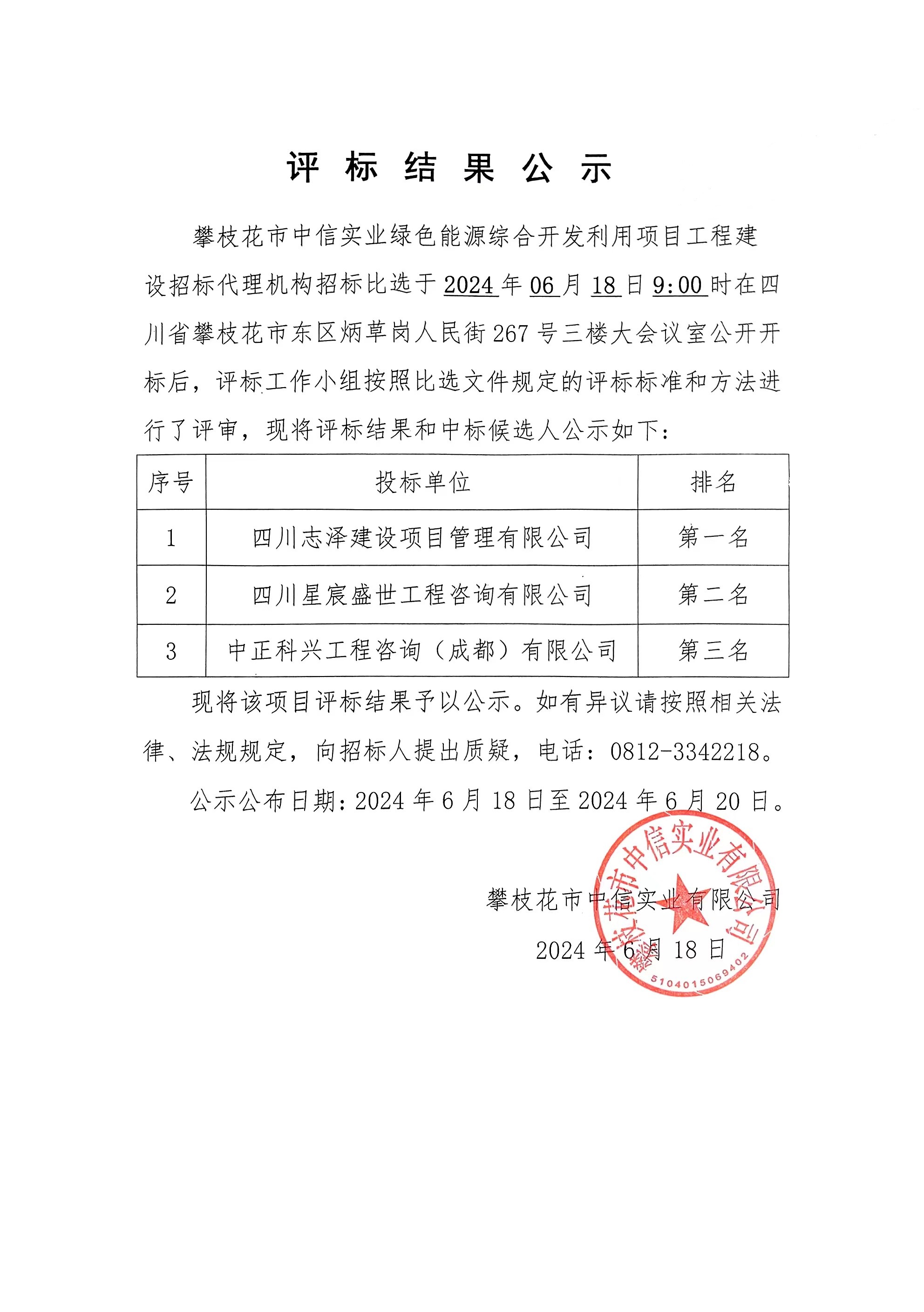 攀枝花市中信實(shí)業(yè)有限公司綠色能源綜合開(kāi)發(fā)利用項(xiàng)目工程建設(shè)招標(biāo)代理機(jī)構(gòu)招標(biāo)比選評(píng)標(biāo)結(jié)果公示